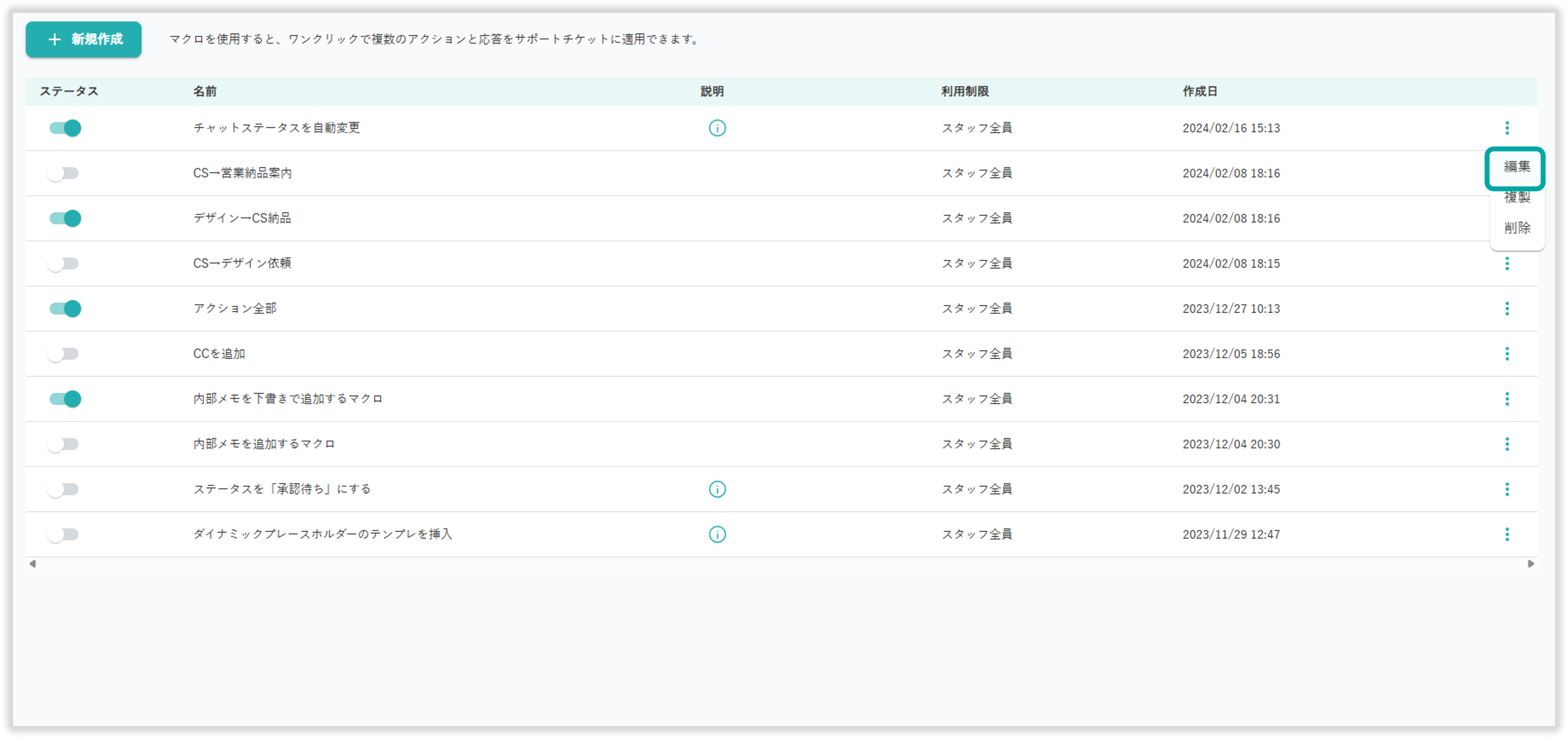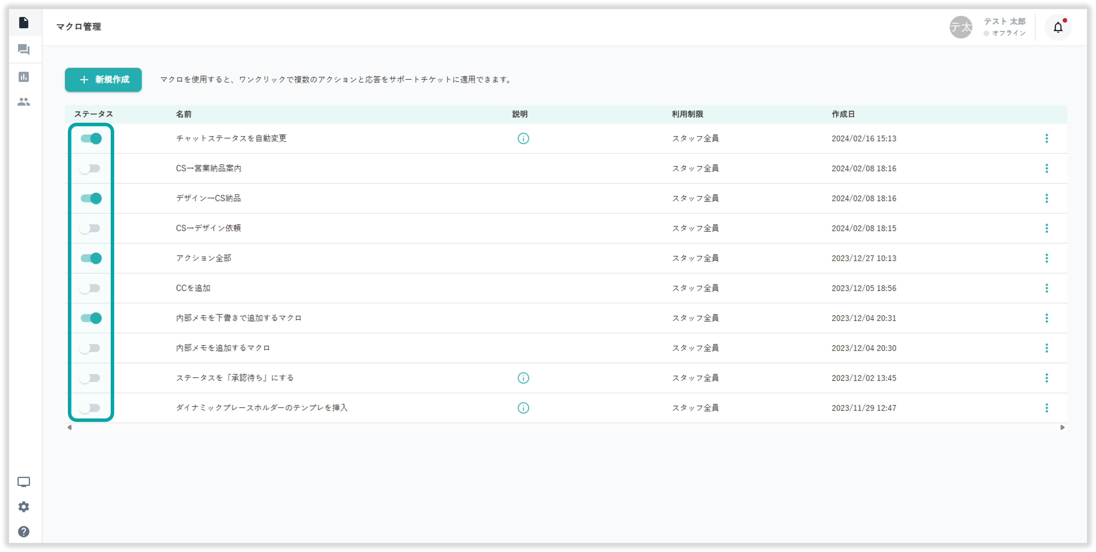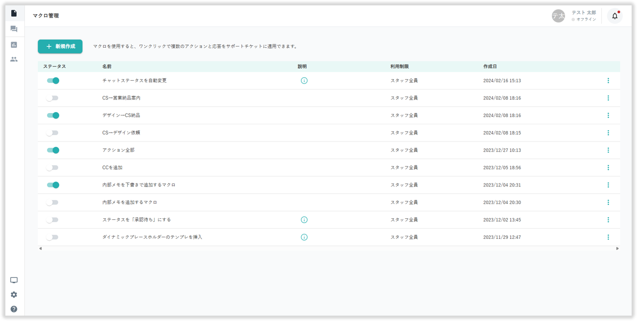 マクロ管理画面の「ステータス」下のトグルからマクロの 有効/無効 を変更できます。