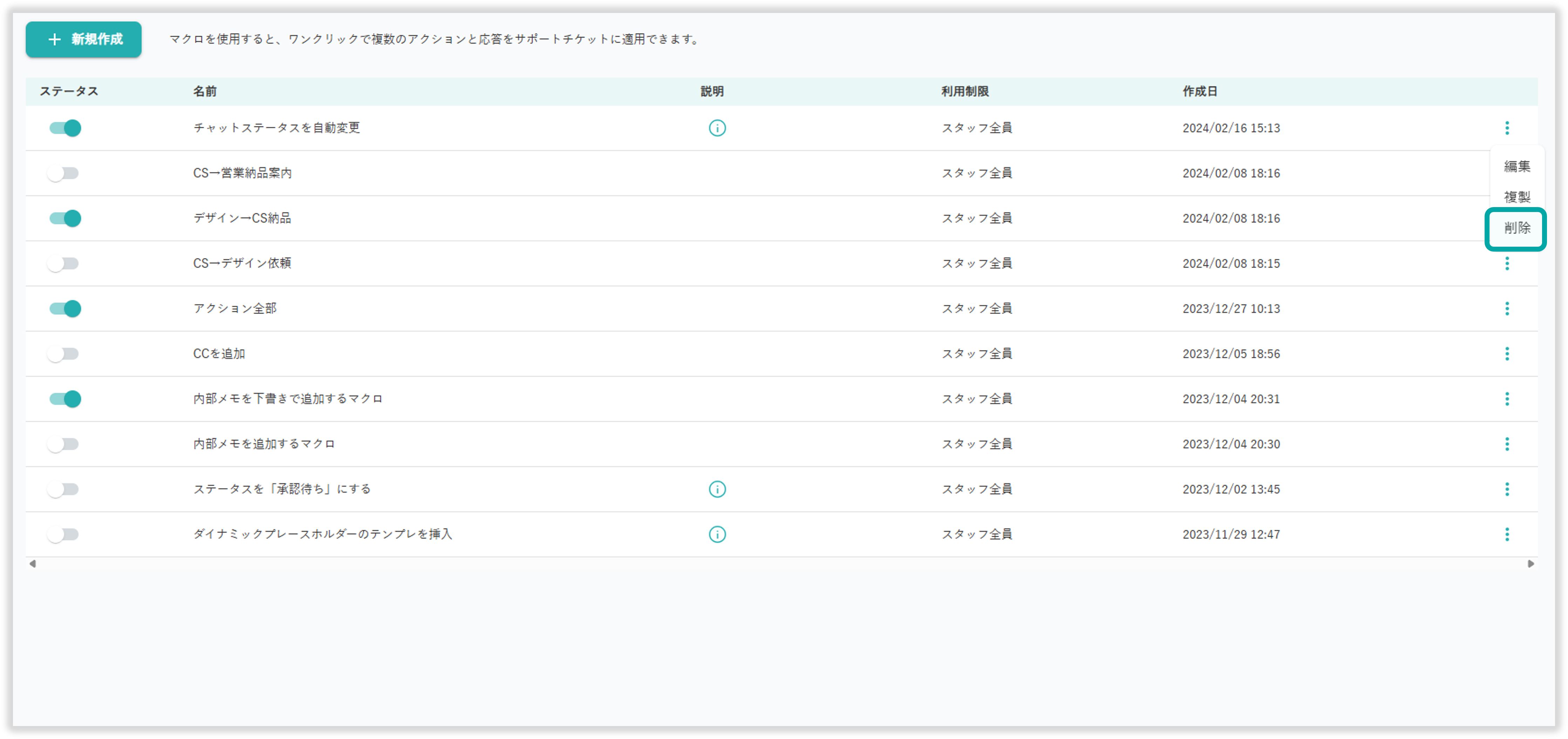 マクロ一覧右側の3点リーダーから「削除」を選択することでマクロの削除が行えます。