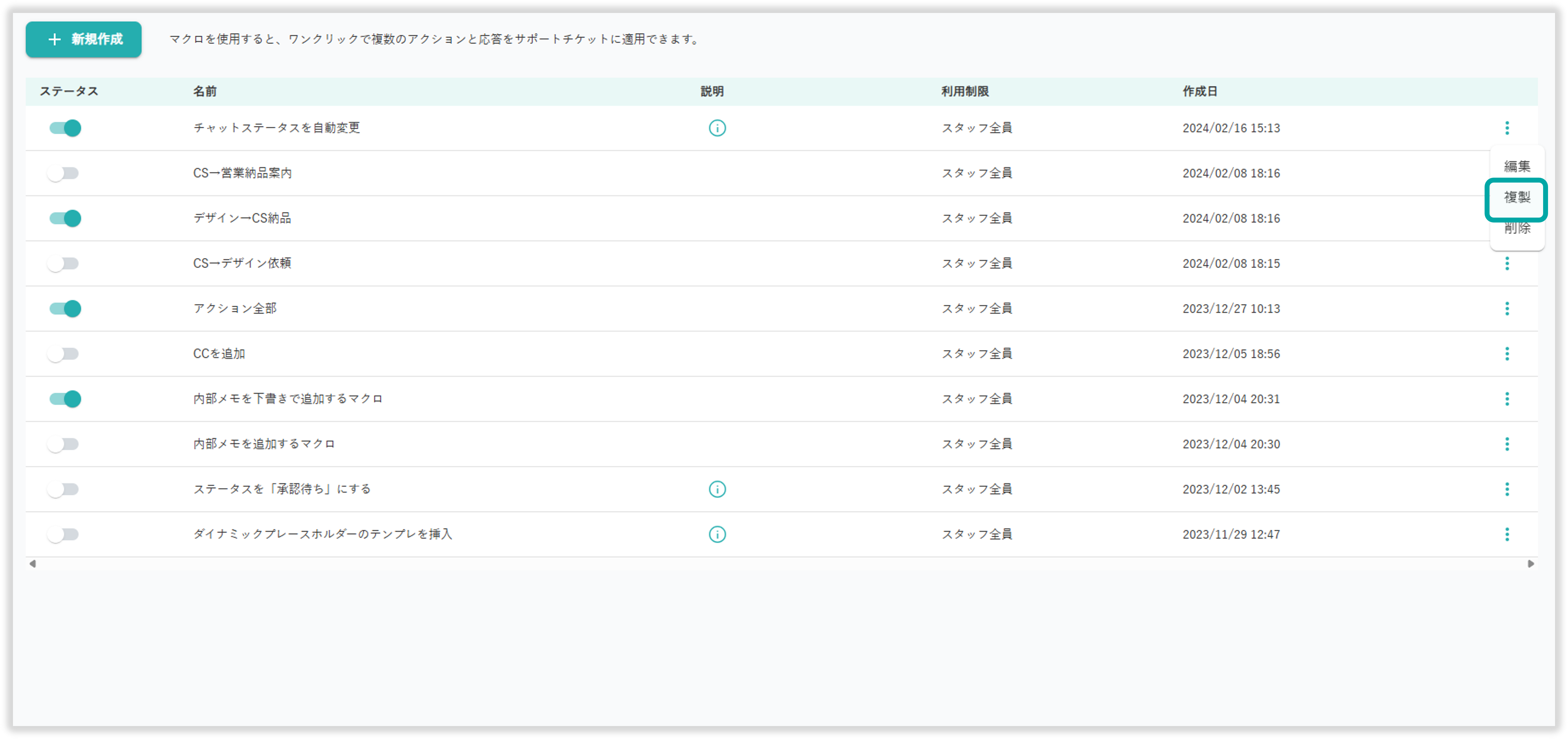 マクロ一覧右側の3点リーダーから「複製」を選択することでマクロの複製が行えます。