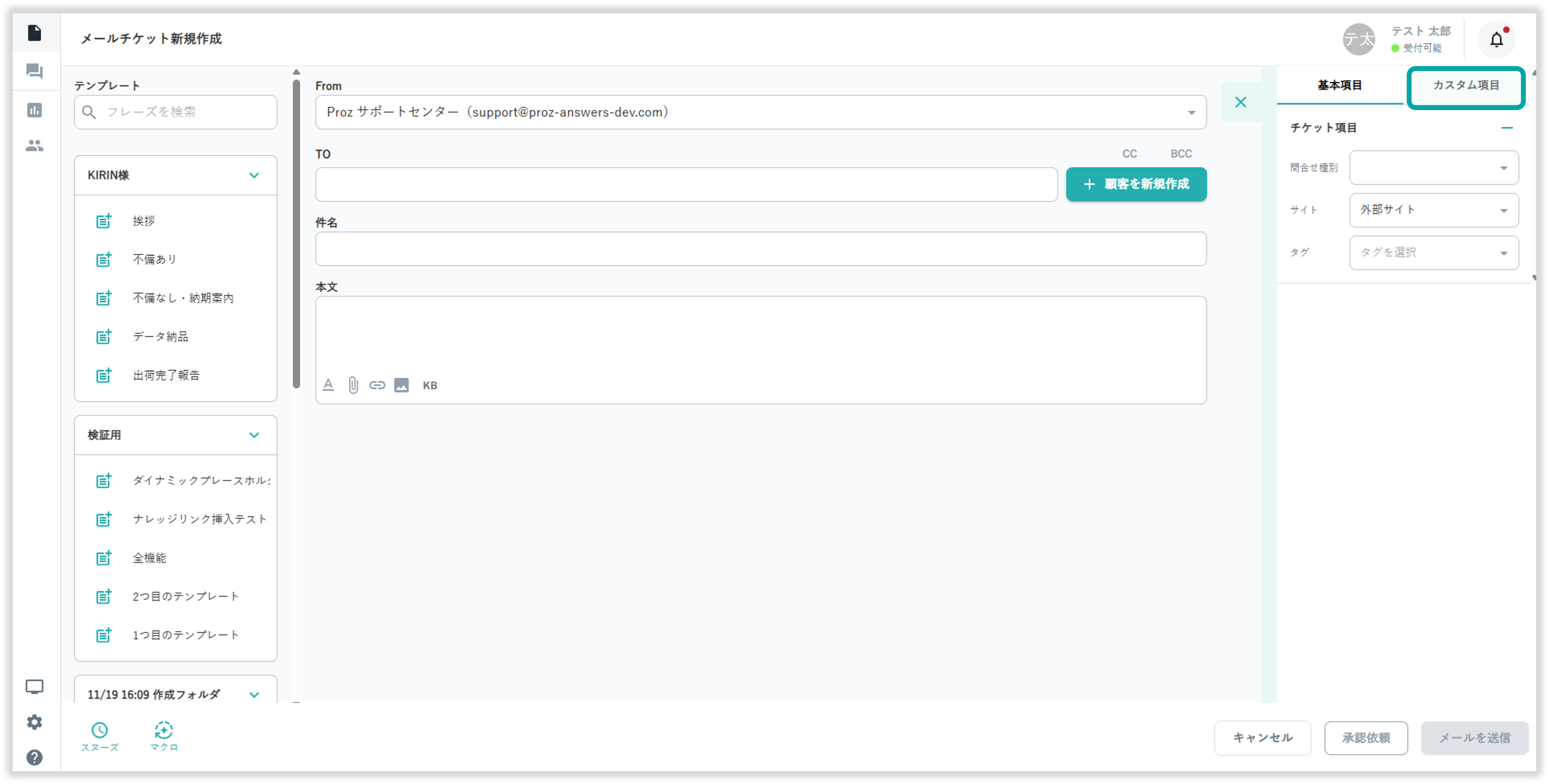 メールチケット作成画面の画面右上の「カスタム項目」を選択することで。あらかじめ登録したカスタム項目の編集ができます。