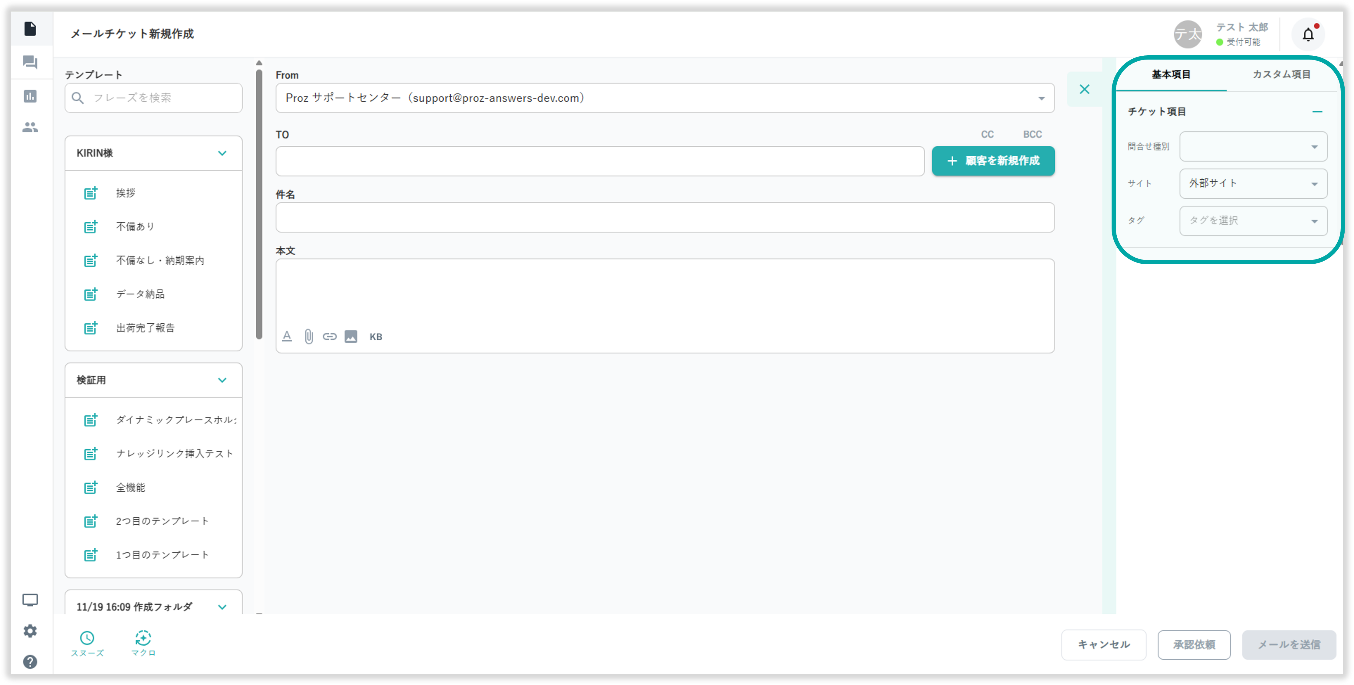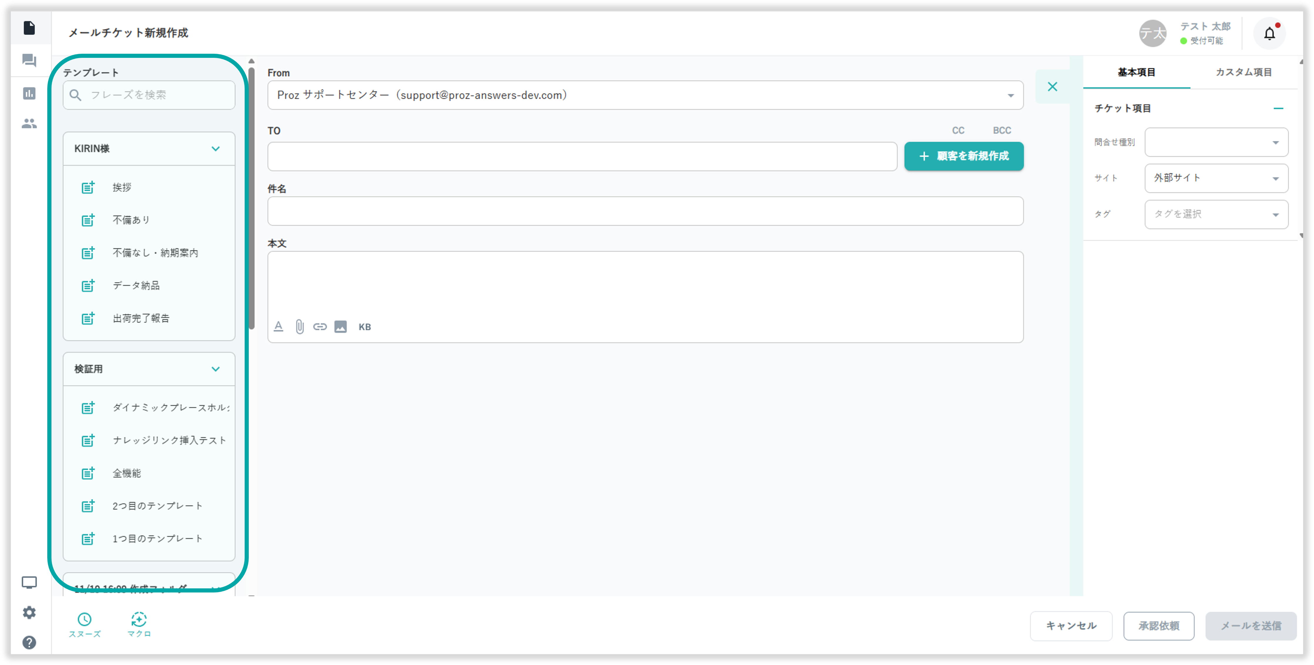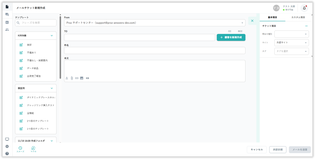 メールチケット作成画面の画面左からあらかじめ登録したテンプレートの挿入が可能です。