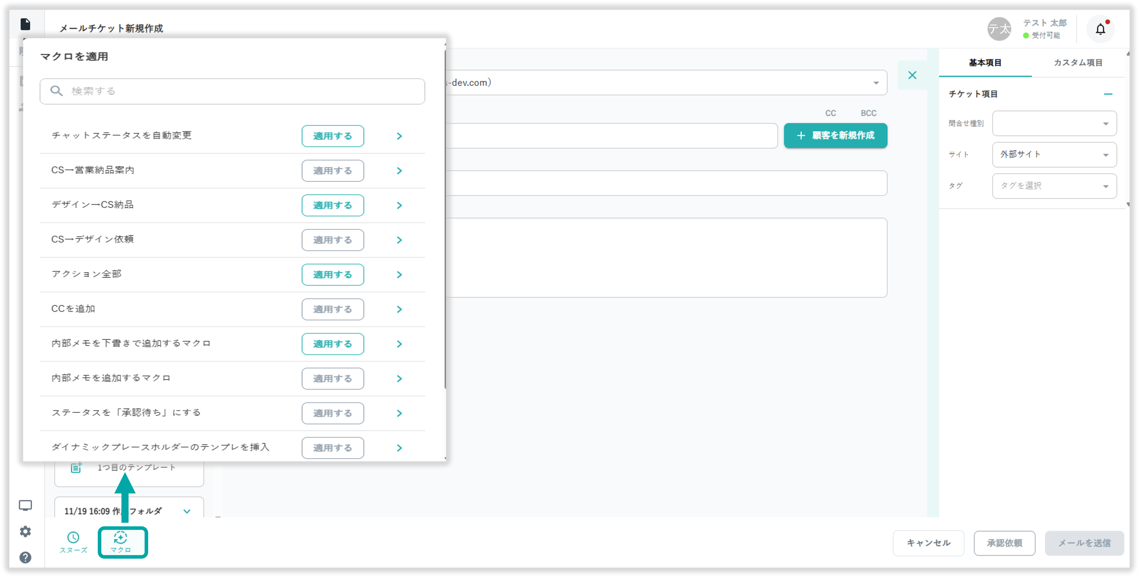 メールチケット作成画面の画面左下からあらかじめ登録したマクロのを利用できます。
