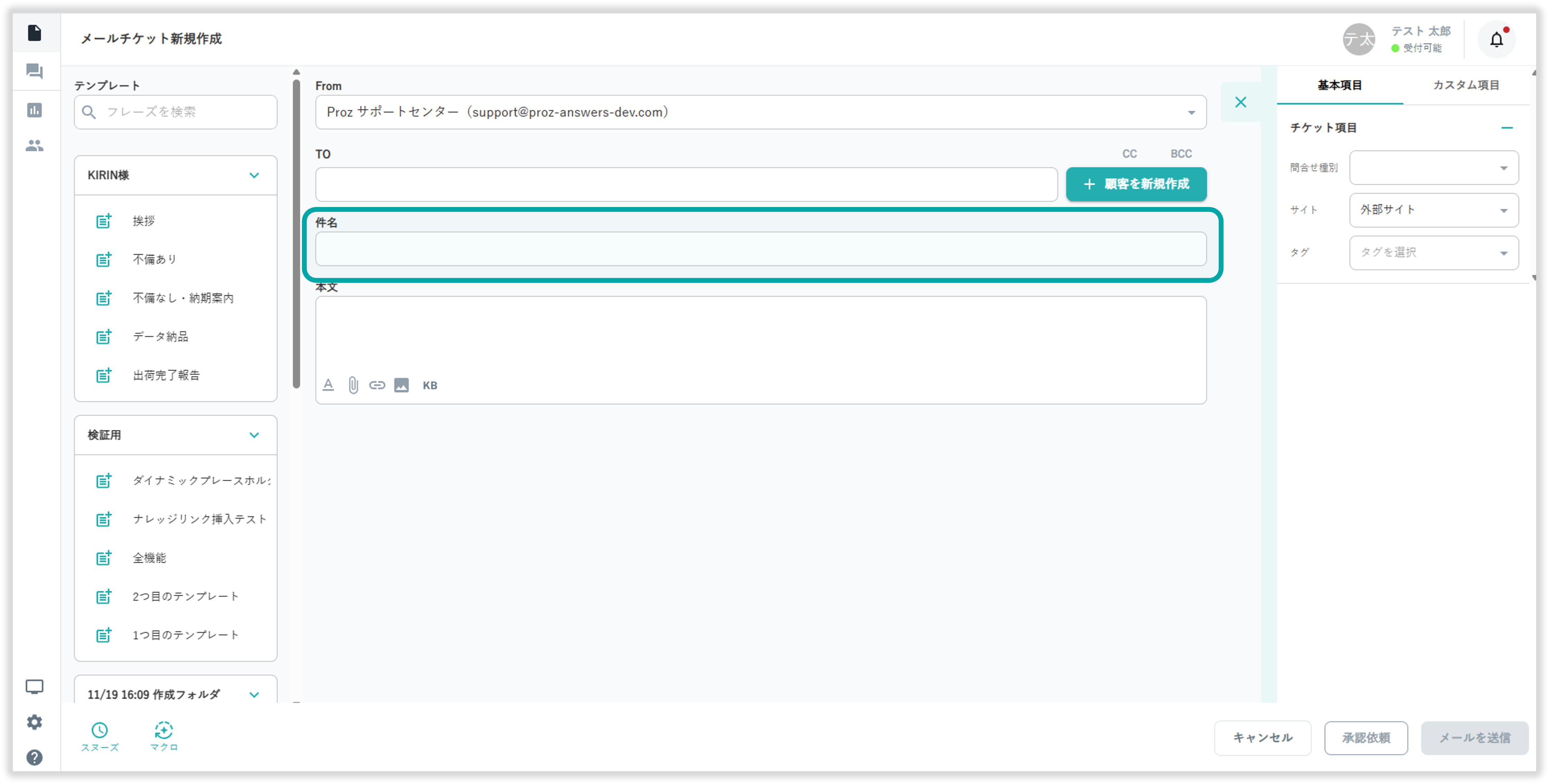 メールチケット作成画面から「件名」の入力が行えます。
