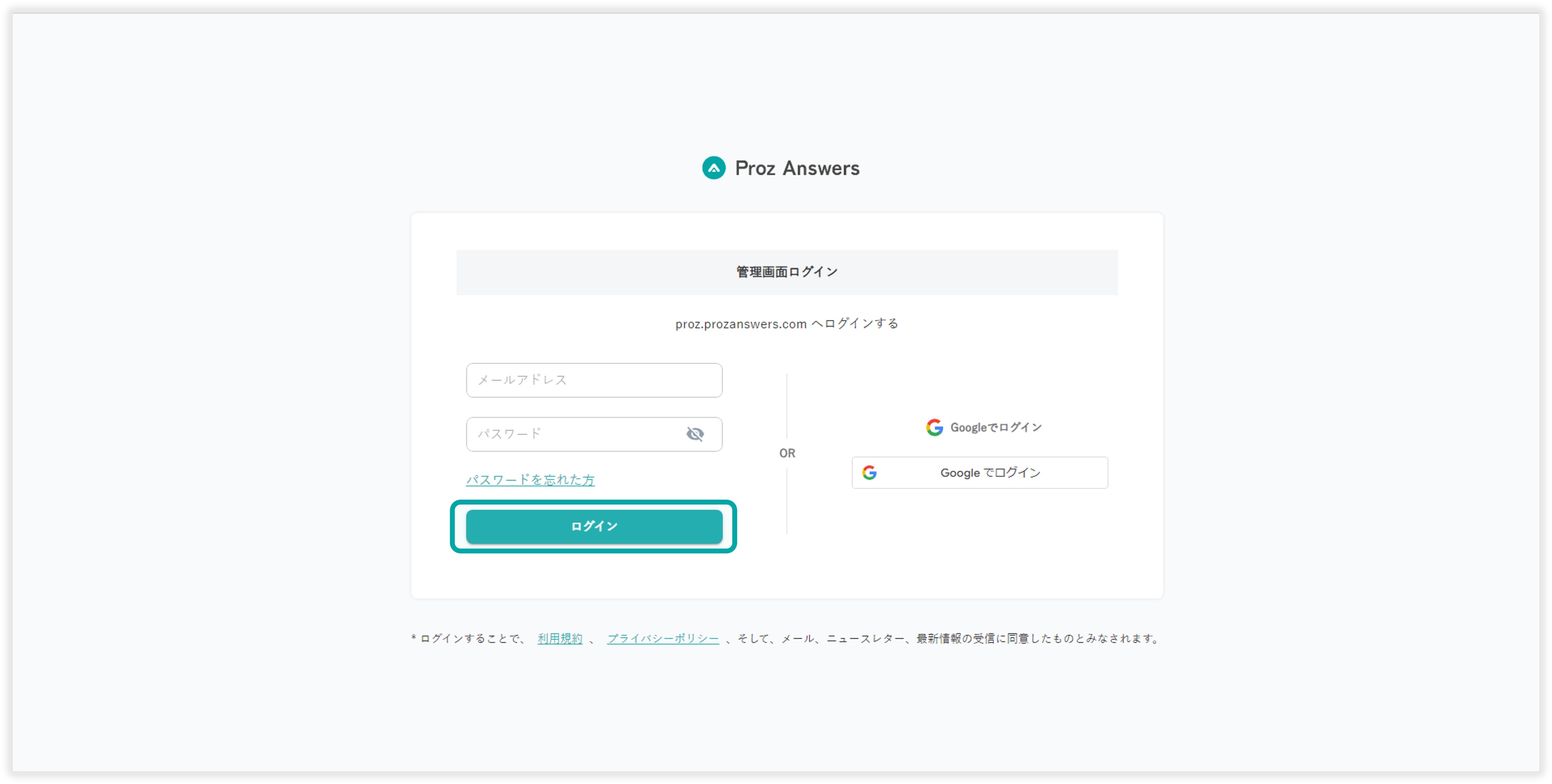 1. Proz Answersにアクセスし、IDとパスワードを入力後「ログイン」を選択します。