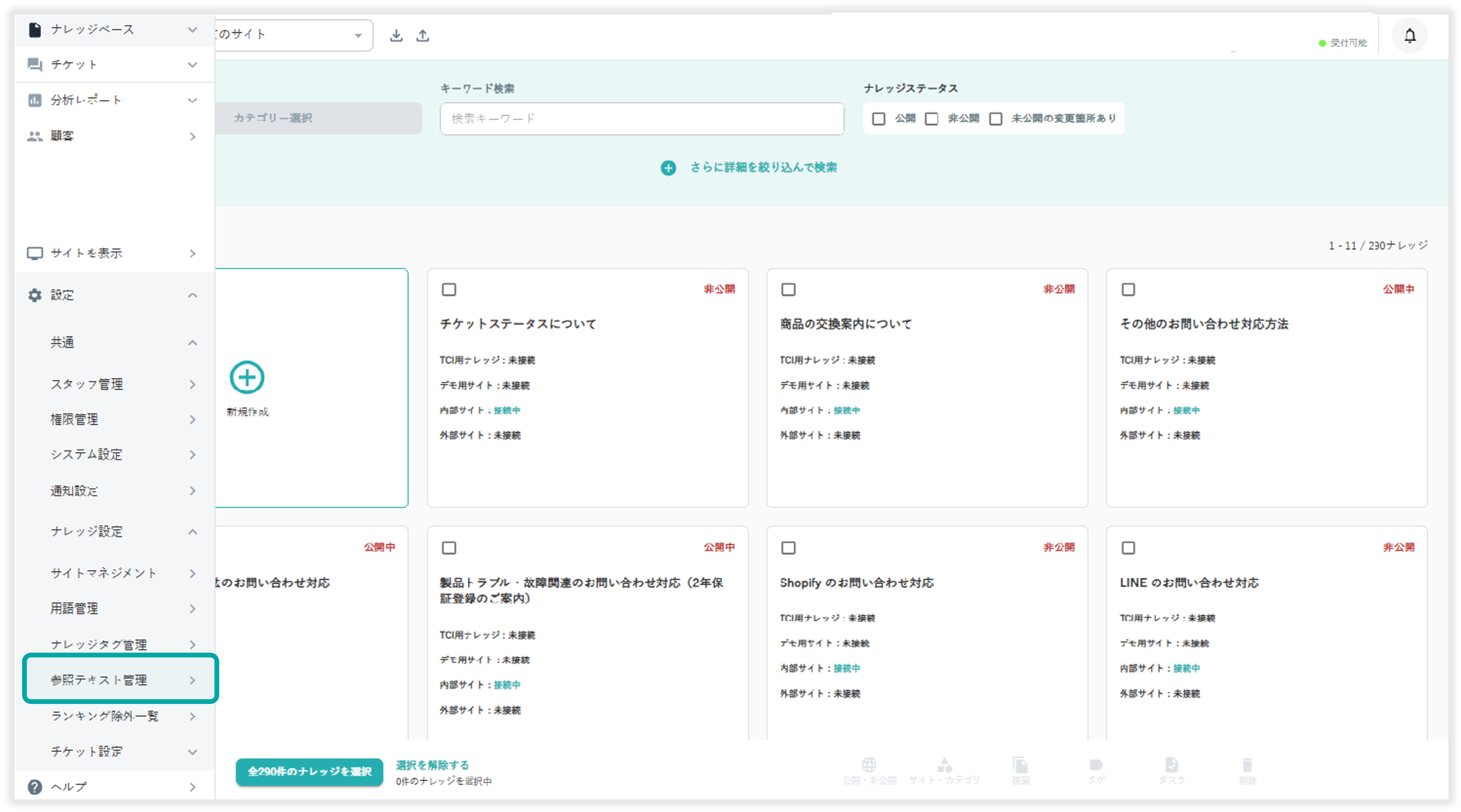 設定>ナレッジ設定>参照テキスト から参照テキストの登録が行えます。