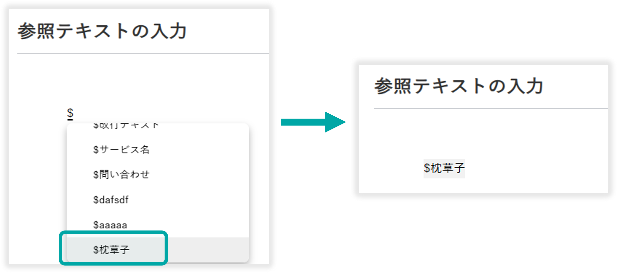 ナレッジ詳細画面で$マークを入力することで、登録した参照テキストを選択できます。
