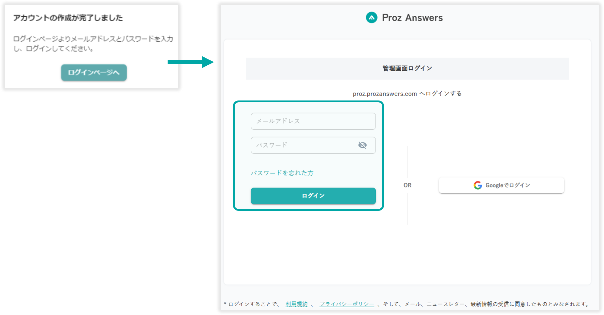 アカウント作成が完了すると「ログインページへ」からログイン画面へ遷移できます。
