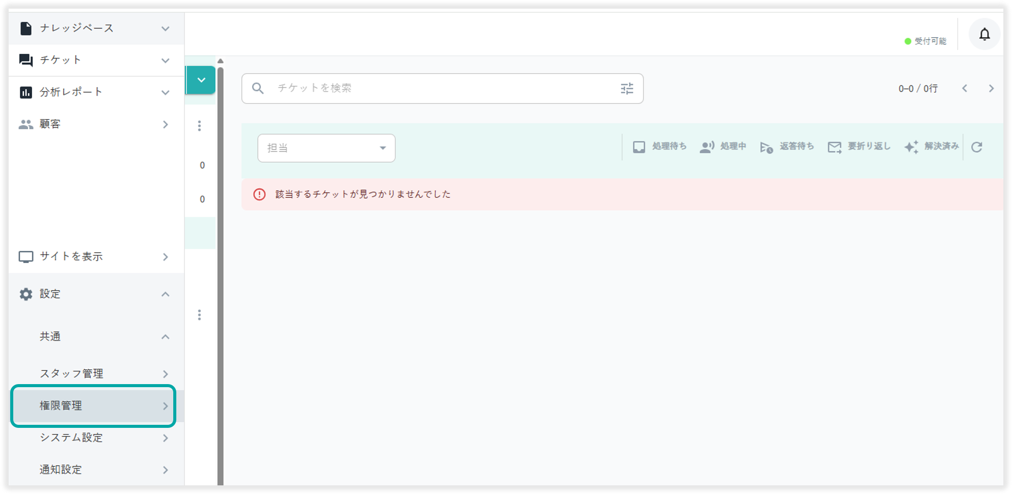 チケットの作成・返信、ナレッジの編集、カテゴリーの編集・削除、レポートの閲覧およびすべての限定公開サイトの閲覧が可能な権限です。