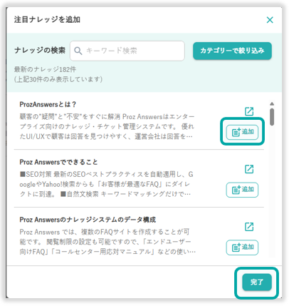 表示されたポップアップの画面右側の「追加」を選択し「完了」を押下することで、注目ナレッジを追加できます。