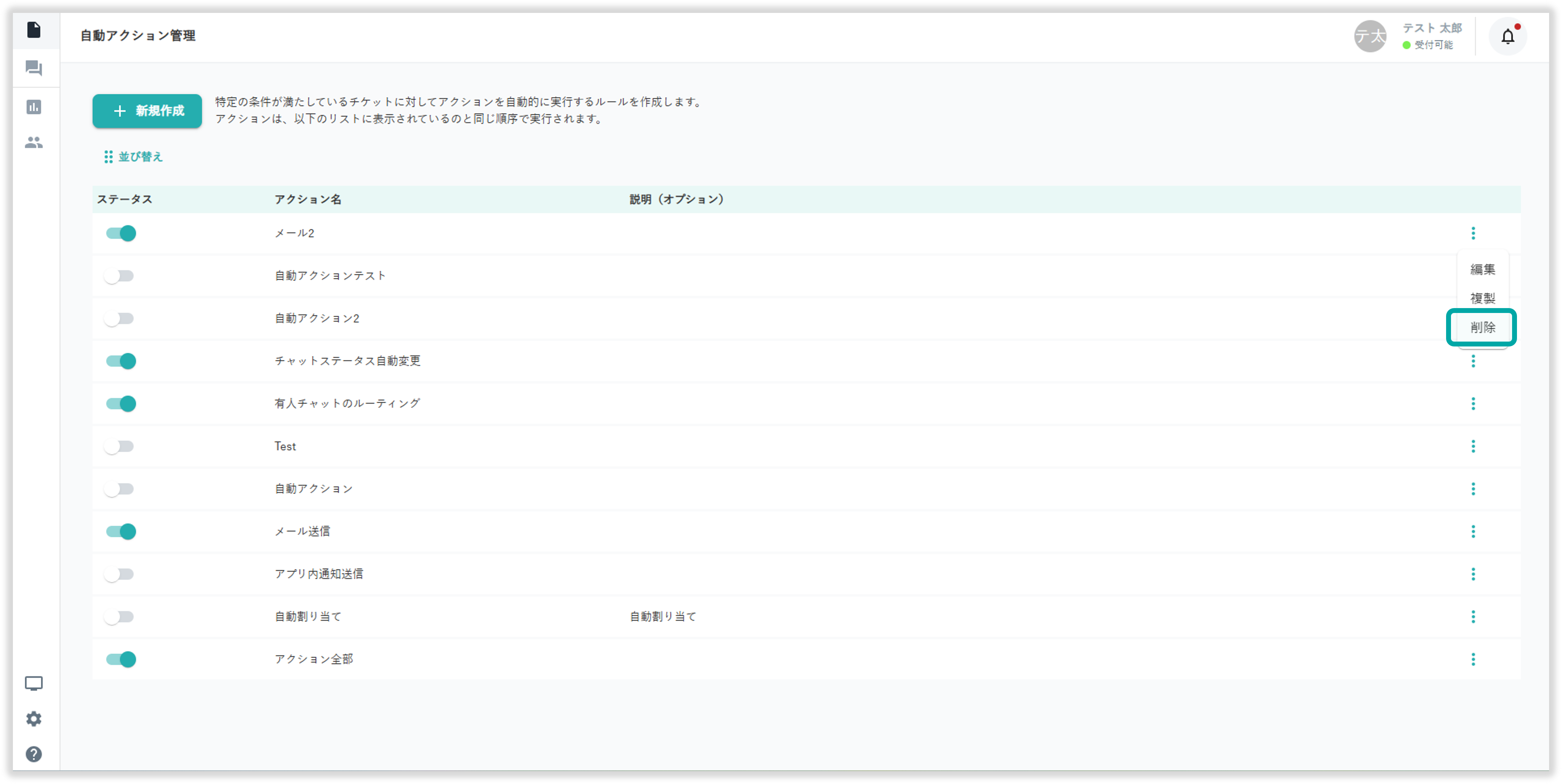 自動アクション一覧右側の3点リーダーから「削除」を選択することで自動アクションの削除が行えます。