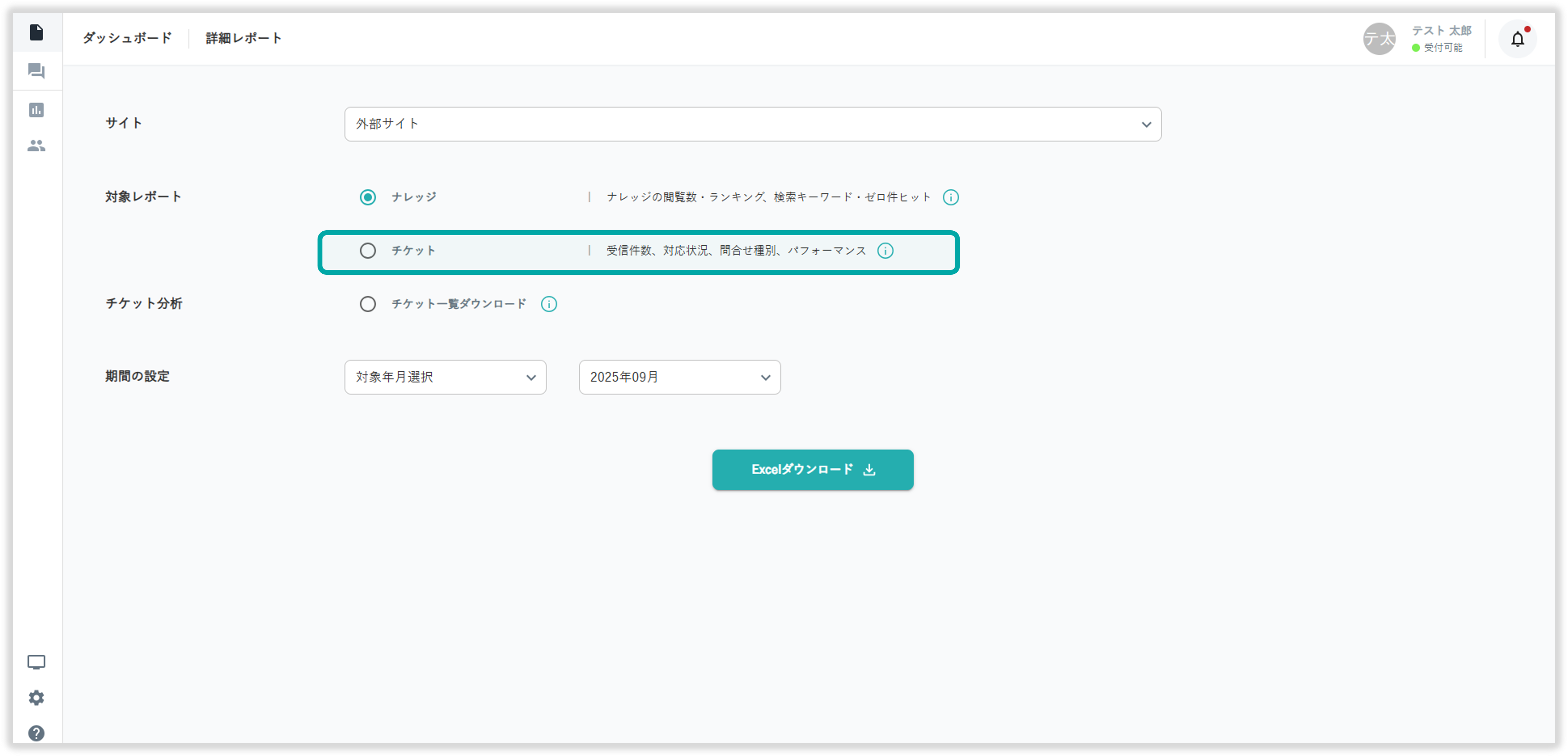 指定した期間内の「総チケット対応件数」が表示されます。1か月前や1年前のデータがある場合は、先月比や前年比を確認することができます。
