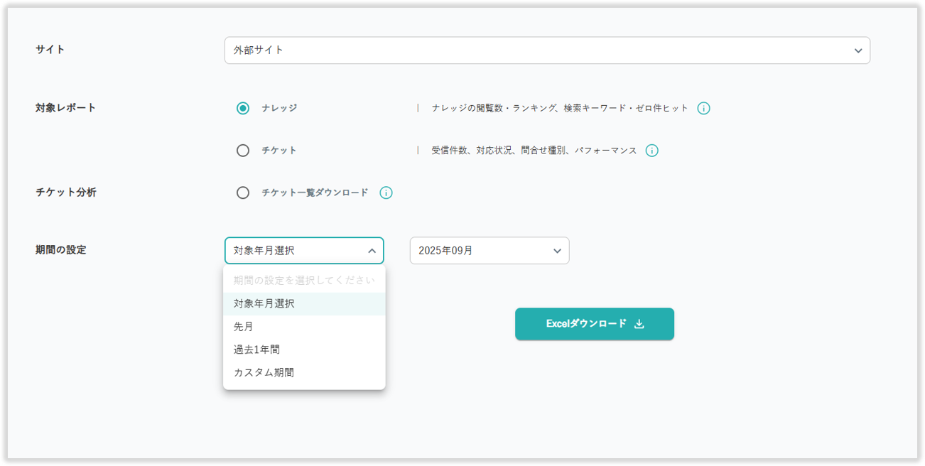 月次サマリーは「期間の設定」を「対象年月日」または「先月」にした場合のみダウンロードできます。