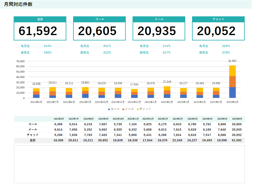 指定した期間内の「コールチケット対応件数」が表示されます。1か月前や1年前のデータがある場合は、先月比や前年比を確認することができます。