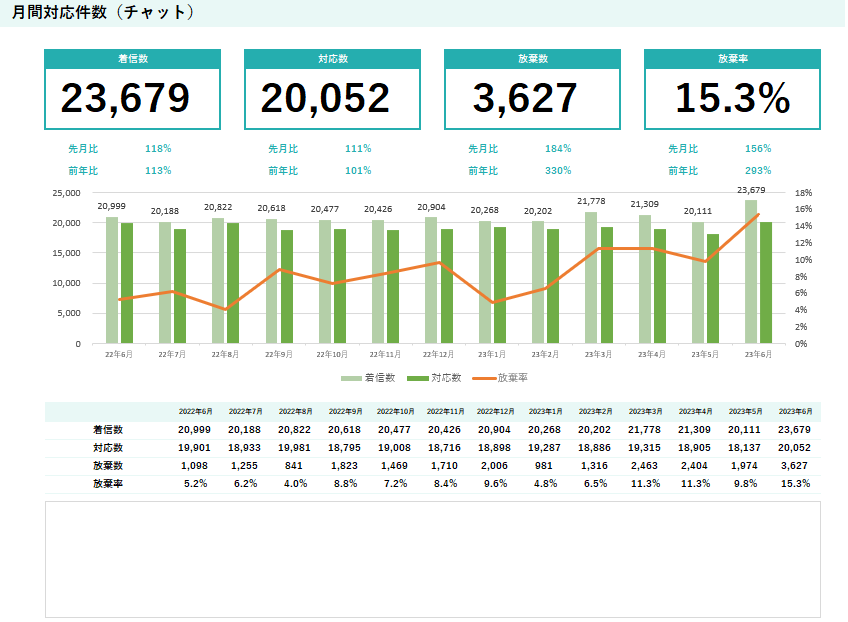 月間対応件数(チャット)ではチャットの「着信数」「対応数」「放棄数」「放棄率」の1か月ごとの推移を簡単に確認できます。