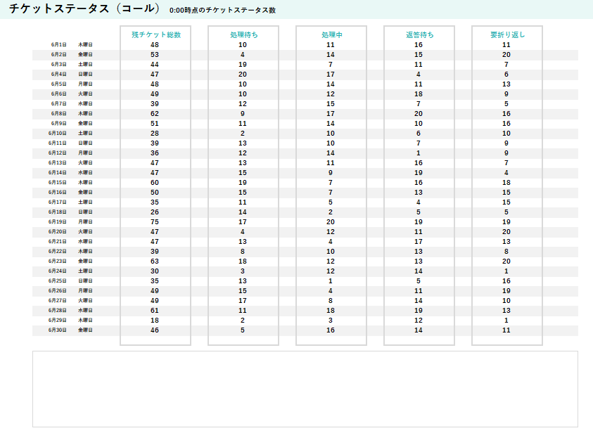 チケットステータス(コール)では、コールチケットステータスが「解決済み」以外のチケットの1日ごとの推移を閲覧できます。残チケット数が増えているのか減っているのか、全体的に業務が追いついているか、折り返し案件が蓄積していっているかどうか等が確認できます。