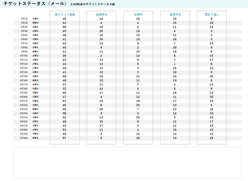 チケットステータス(メール)では、メールチケットステータスが「解決済み」以外のチケットの1日ごとの推移を閲覧できます。残チケット数が増えているのか減っているのか、全体的に業務が追いついているか、折り返し案件が蓄積していっているかどうか等が確認できます。