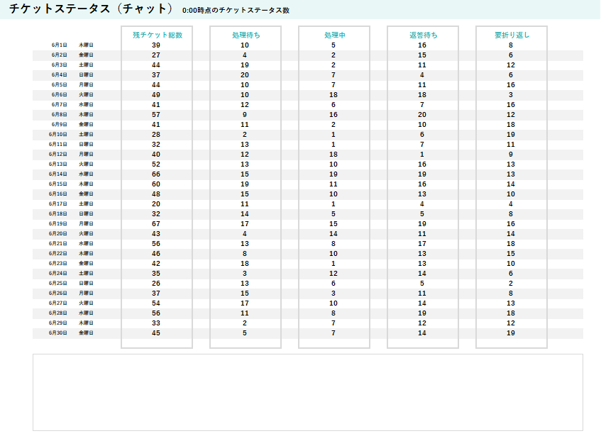 チケットステータス(チャット)では、チャットチケットステータスが「解決済み」以外のチケットの1日ごとの推移を閲覧できます。残チケット数が増えているのか減っているのか、全体的に業務が追いついているか、折り返し案件が蓄積していっているかどうか等が確認できます。
