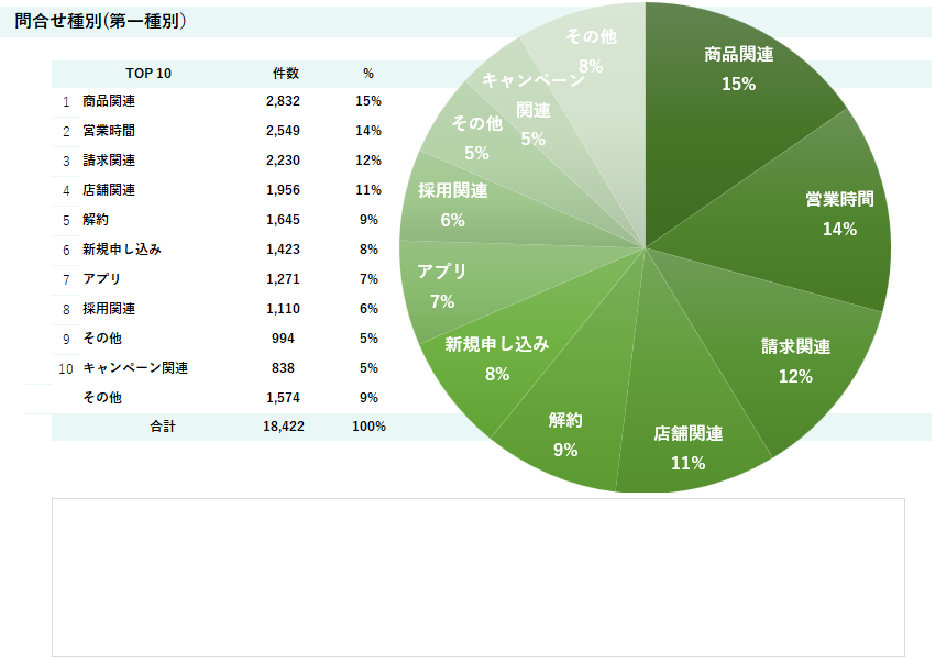 お問い合わせ種別(第一種別)ではチケットのお問い合わせ種別の第一階層の件数(上位10種)と割合が確認できます。