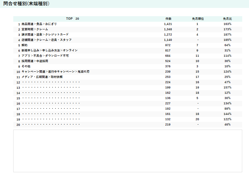 問合せ種別(末端種別)ではチケットのお問い合わせ種別の最下層の件数(上位20種)と先月順位、先月費が確認できます。