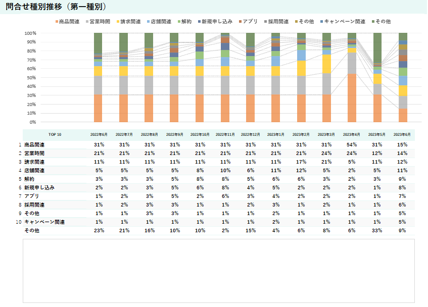 問合せ種別推移(第一種別)では指定した期間のチケットのお問い合わせ種別の第一階層の件数の上位10種の1か月ごとの推移を確認できます。