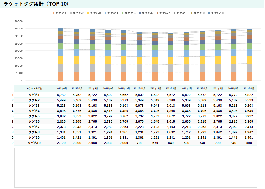 チケットタグ集計(TOP 10)では指定した期間のチケットタグの上位10種の1か月ごとの推移を確認できます。