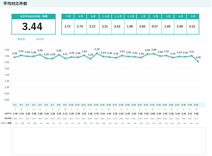 平均対応件数ではチケット対応にかかった平均時間を月別に確認できます。
