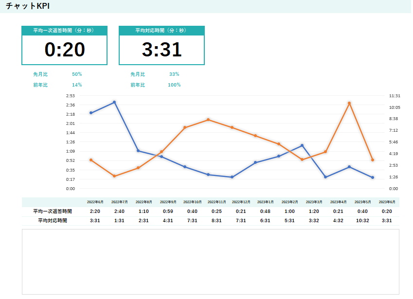 チャットKPIはチャットチケットの一時返信にかかった平均時間とチャットの対応完了までの平均時間を月別に確認できるグラフです。