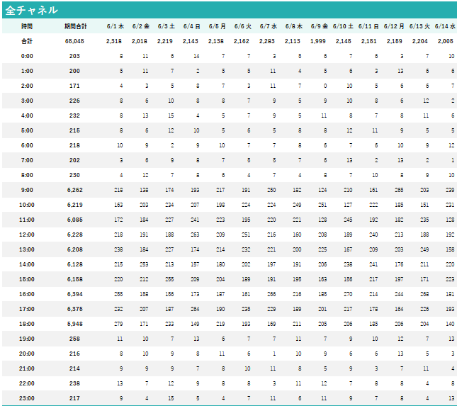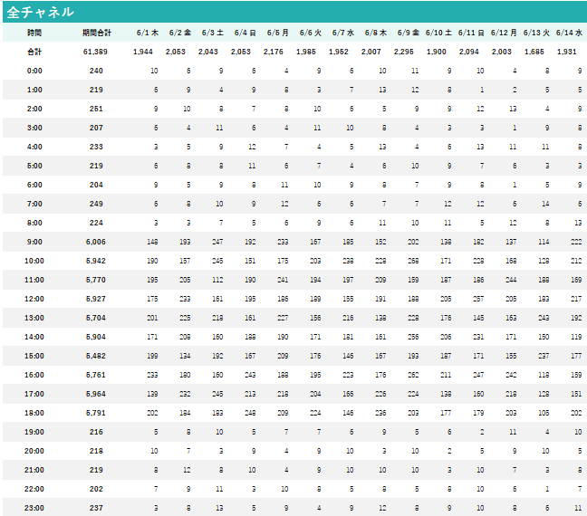 受信件数は指定した期間のチケット総受信件数とチャネルごとの受信件数を1時間ごとに確認できます。