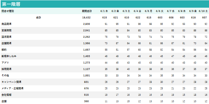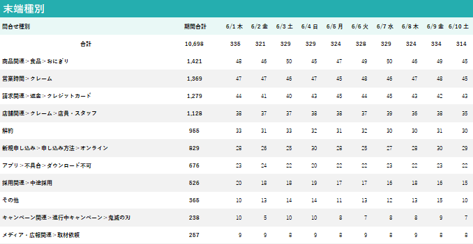 お問い合わせ種別(末端種別)は指定した期間のチケットのお問い合わせ種別の最下層を1日ごとに確認できます。