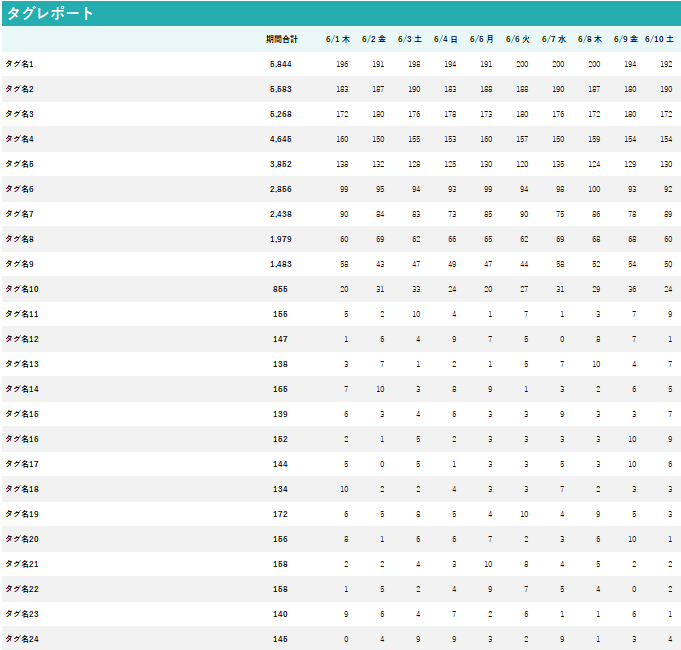 タグは指定した期間のチケットに使用されたタグの件数を1日ごとに確認できます。