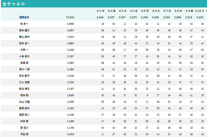 スタッフ実績は指定した期間のスタッフ別「チケット対応件数」「チケット対応平均時間」「チャネル別対応件数」「メール返信件数」「承認依頼件数」「承認数」「承認依頼数」「差し戻し件数」「差し戻され件数」を1日ごとに確認できます。
