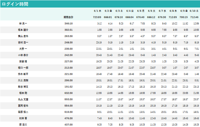 ログインは指定した期間のスタッフ別「ログイン時間」「受付不可時間」を1日ごとに確認できます。