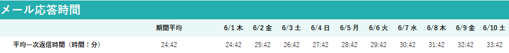 顧客がメールをしてから最初の返信を受け取るまでの時間を把握できます。(スタッフが承認依頼、内部メモを追加、担当をアサインした等のタイミングではありません。)