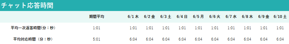 応答時間(チャット)は指定した期間のチャットの1次返信に掛かった平均時間と、チャット完了までの平均時間を1日ごとに確認できます。