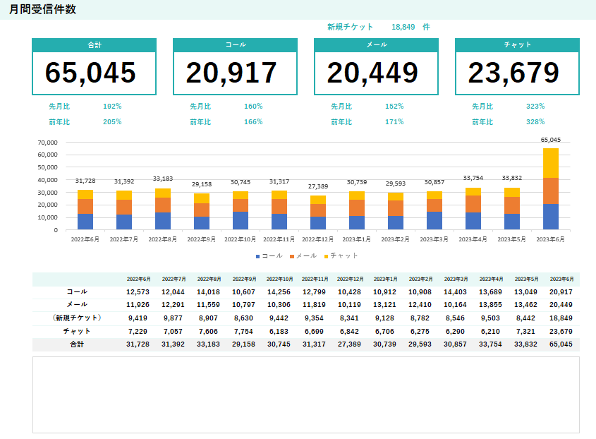 指定した期間内の「総チケット数」が表示されます。1か月前や1年前のデータがある場合は、先月比や前年比を確認することができます。