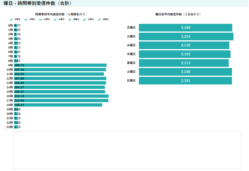 曜日・時間帯別受信件数(合計)では、1時間毎のチケット平均受信件数と曜日別のチケット平均受信件数が確認できます。