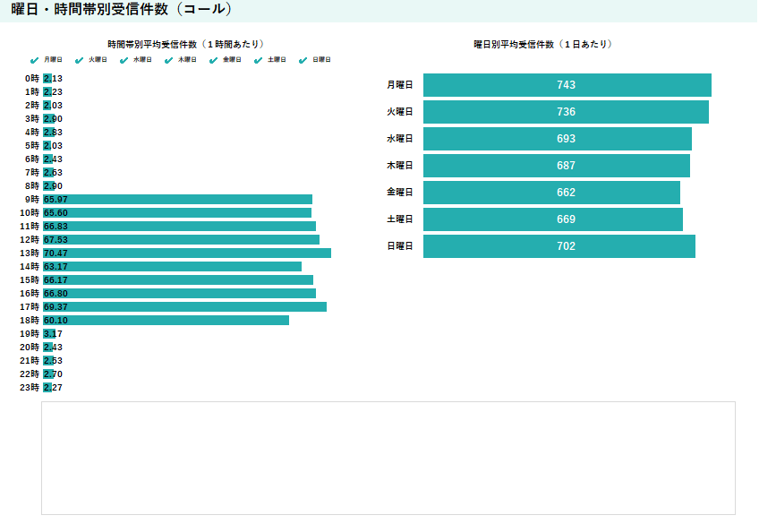曜日・時間帯別受信件数(コール)では、1時間毎のコールチケット平均受信件数と曜日別のコールチケット平均受信件数が確認できます。