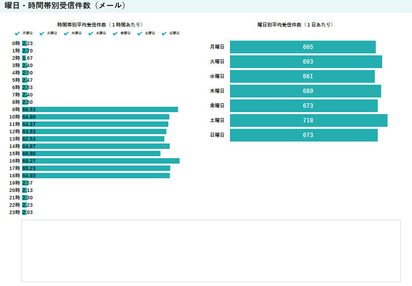 曜日・時間帯別受信件数(メール)では、1時間毎のメール平均受信件数と曜日別のメール平均受信件数が確認できます。