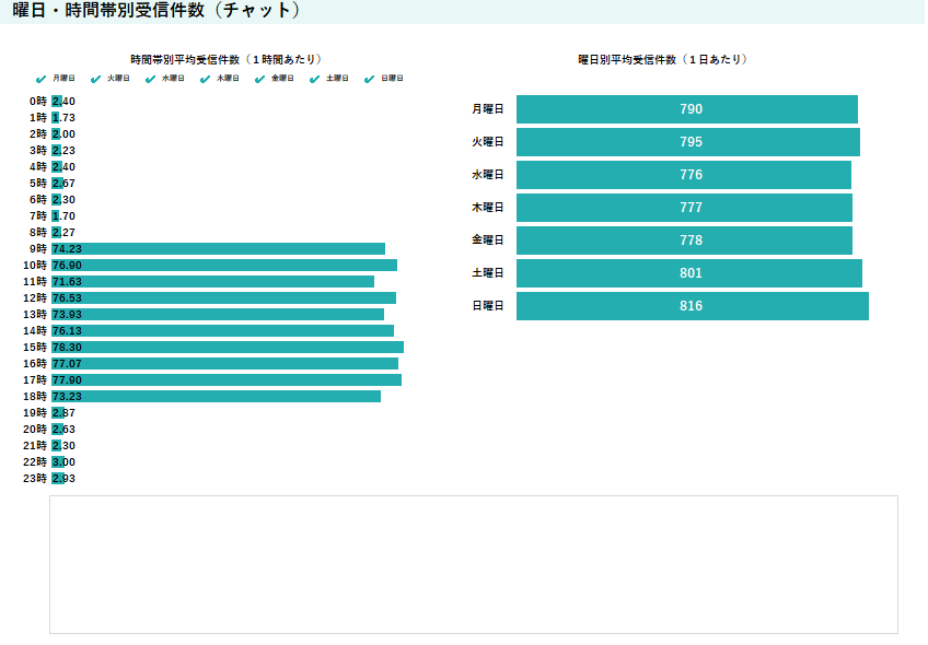 曜日・時間帯別受信件数(チャット)では、1時間毎のチャットチケット平均受信件数と曜日別のチャットチケット平均受信件数が確認できます。