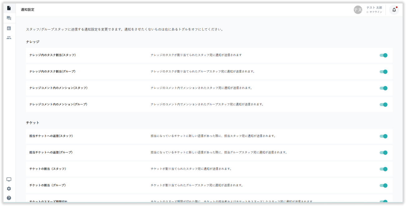 通知管理画面では、任意の通知の ON/OFF を切り替えることができます。画面左下から 設定>共通>通知設定 を選択することでユーザー管理画面を閲覧できます。