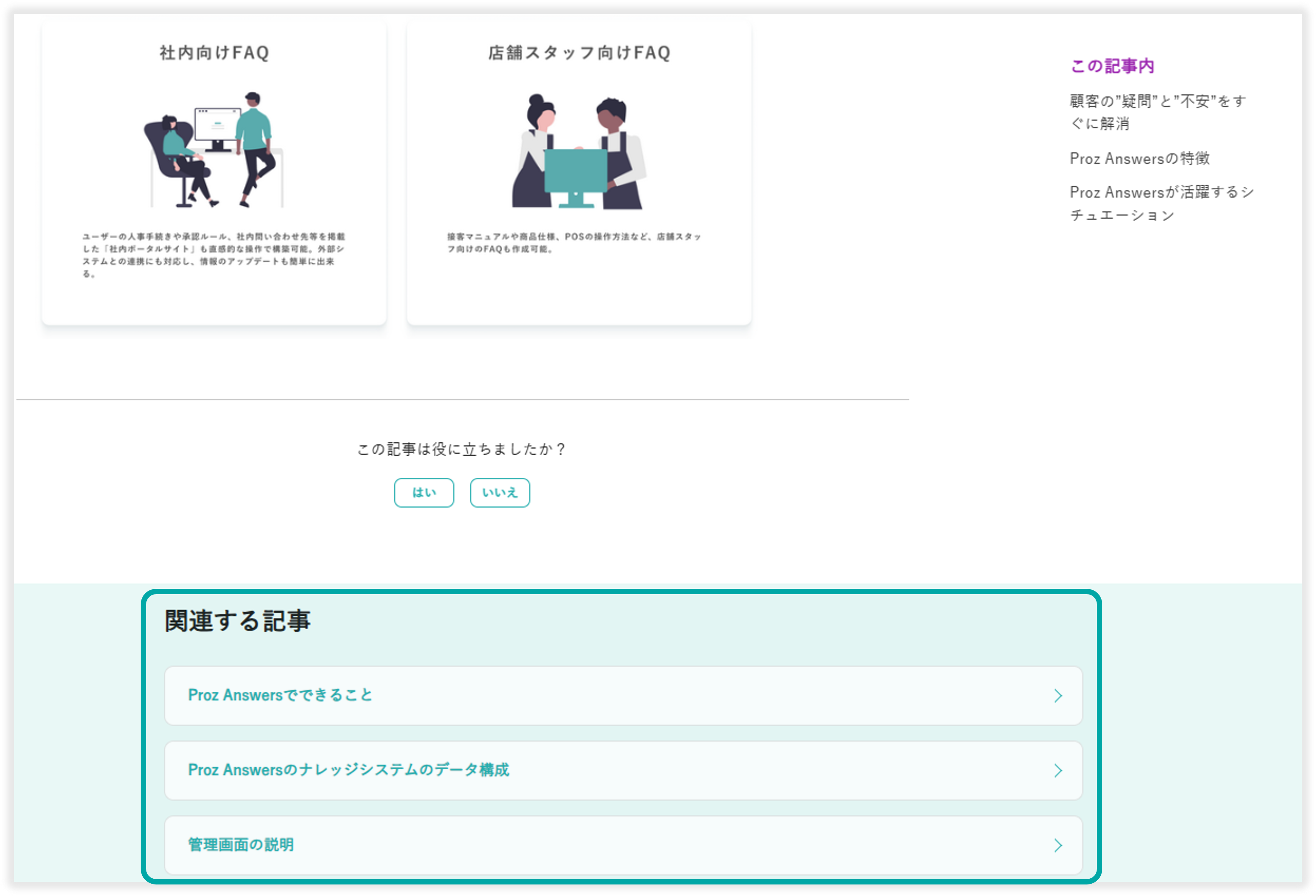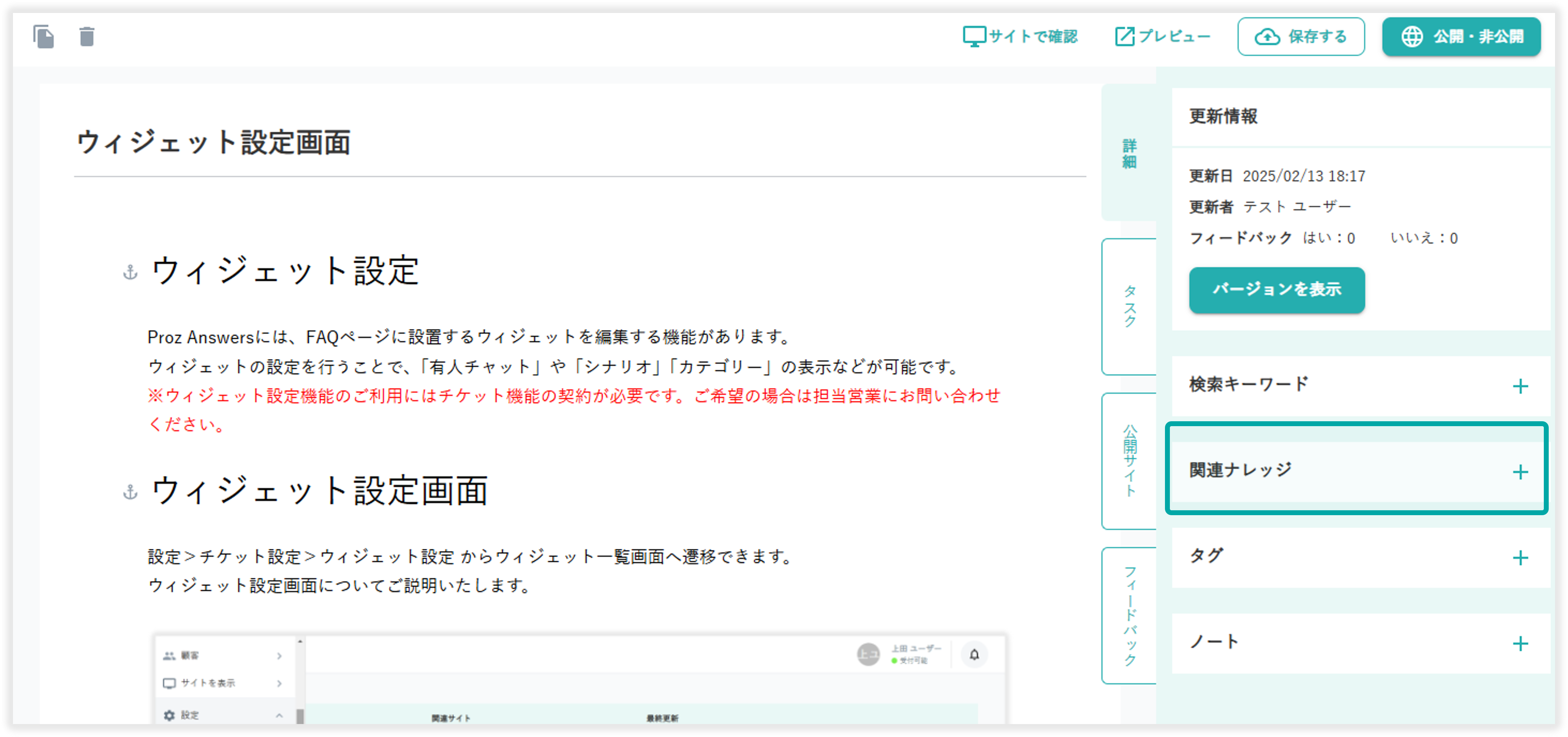 関連ナレッジを追加することで、公開ナレッジの画面下部に設定したナレッジがリストとして表示されます。ナレッジを追加して、読者が知りたいと思われる補足情報に導くことができます。