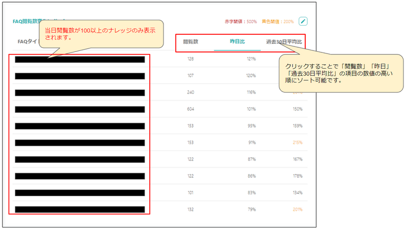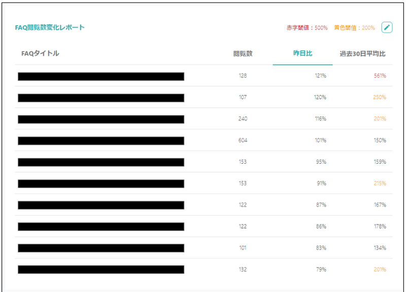 FAQ閲覧数変化レポートの「昨日比」「過去30日平均比」の閾値を設定できます。