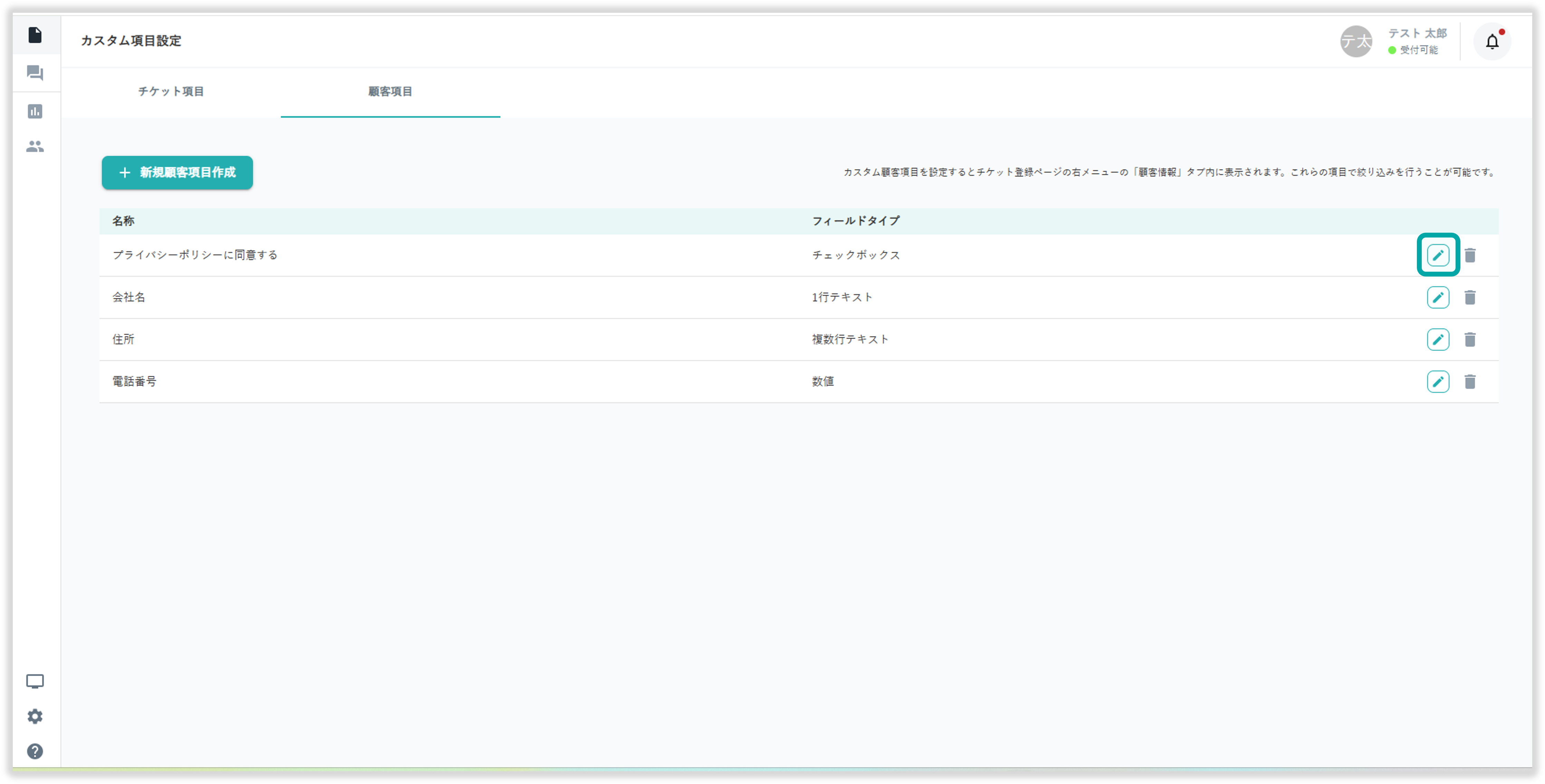 画面左下の 設定>チケット設定>顧客カスタム項目 を選択することで顧客カスタム項目管理画面を閲覧できます。本ナレッジでは顧客カスタム項目の編集方法をご説明いたします。